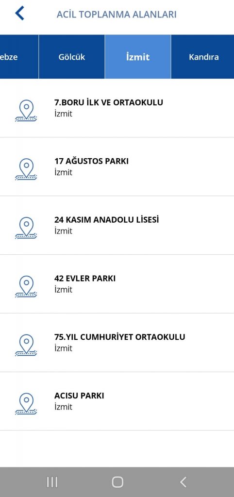 Kocaeli Büyükşehir Belediyesi sürecin daha hızlı ilerleyebilmesi için yeni bir çalışma yaptı. Olası afet durumlarında vatandaşların toplanması gereken Acil Toplanma Alanlarının konumu web tabanlı Şehir Rehberi ve e-Kocaeli mobil uygulamasına yüklendi. Vatandaşlar, il genelinde yer alan 338 adet Acil Toplanma Alanını konumsal olarak uygulama üzerinden görebiliyor.