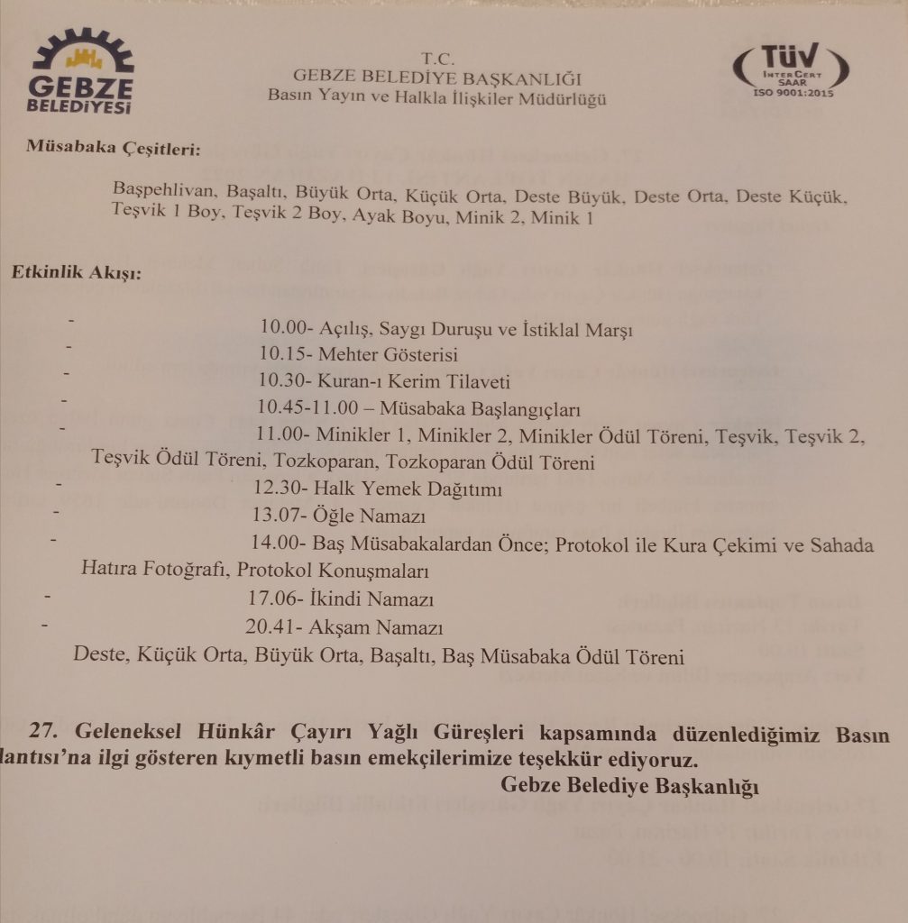 Gebze Belediye Başkanı Zinnur Büyükgöz, bugün yaptığı basın toplantısında, Gebze 27.Geleneksel Hünkar Çayırı Yağlı Güreşleri 'nin 19 Haziran, Pazar günü yapılacağını açıkladı.