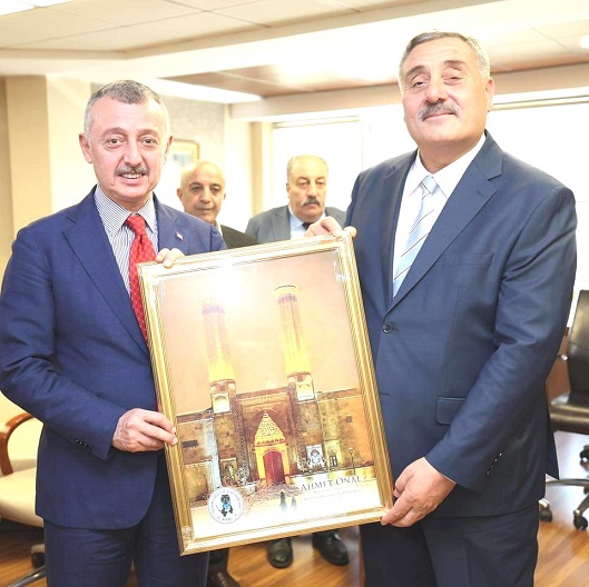 Bu arada karşılıklı iyi niyet dileklerinin ardından ziyaretin sonunda Vakıf Başkanı Ahmet Önal, Büyükşehir Belediye Başkanı Büyükakın’a Erzurum’un tarihi mekanlarından olan Çifte Minareli Medrese tablosunu hediye etti.