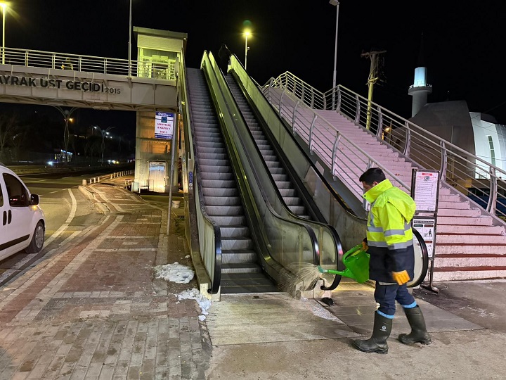Büyükşehir Belediyesi'ne bağlı ekipler, özellikle vatandaşların yoğun olarak kullandığı durak önleri, üst geçitler, merdivenler ve hastane girişlerinde solüsyon ve tuzlama çalışmaları gerçekleştirdi. Gece boyunca devam eden çalışmalar, yeni yılın ilk saatlerinde de kesintisiz şekilde sürdürüldü.