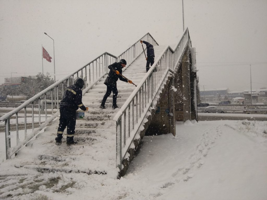 Bir yandan onlarca iş makinesiyle köy yollarında ve ilçelerin bağlantı yollarında çalışmalarını aralıksız sürdüren ekipler, bir yanda da buzlanma ihtimaline karşı tüm kentteki yaya üst geçitlerinde solüsyon ve tuzlama çalışmalarını yerine getiriyor. Yollarda ve eğimi yüksek caddelerde hummalı bir çalışma yürüten ekipler, iş makinalarıyla önce kardan temizlenen yollara ardından solüsyon döküyor.