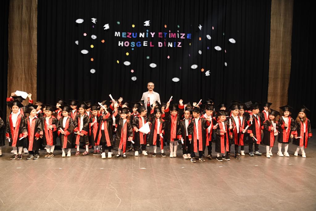 Mezuniyet kıyafetlerini giyen minik öğrenciler Başkan Bünyamin Çiftçi’nin elinden hayatlarındaki ilk diplomalarını almanın mutluluğunu yaşadılar.