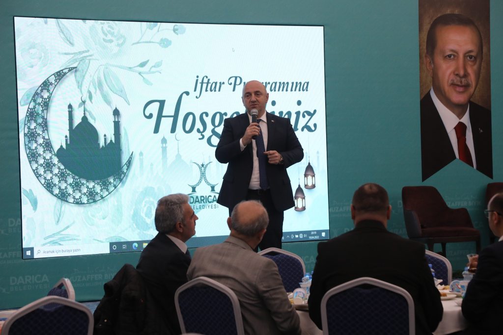 Darıca Belediyesi’nin düzenlediği iftar buluşması ilçe protokolünü bir araya getirdi. Darıca sahilde yeni hizmete açılan toplantı ve konferans salonunda Belediye Başkanı Muzaffer Bıyık’ın ev sahipliğinde gerçekleşen iftar programına ilçe protokolü ile birlikte kurum amirleri, siyasi parti temsilcileri, meclis üyeleri, muhtarlar, dernek başkanları, sivil toplum kuruluşu temsilcileri ve birim müdürleri katıldı. İftar yemeği Kur’an-ı Kerim tilavetiyle başladı. Ezanın okunmasıyla hep birlikte oruçlar açıldı. Yemeğin ardından ise dua edildi.