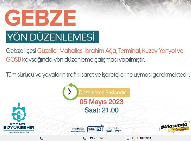Kocaeli Büyükşehir Belediyesi UKOME tarafından alınan yeni bir kararla, bölgemizin trafik yönünden Gebze Organize Sanayi Bölgeleri tarafına en yoğun güzergahları olan Gebze ,Güzeller Mahallesi İbrahimağa-Terminal Yolu-Kuzey Yanyol ve GOSB Kavşağında bu gece saat 21:00 itibariyle yeni bir yön değişikliğine gidilecek. Tek yön uygulaması olarak gerçekleşen değişiklik görselde görüldüğü şekilde uygulanacak. Bu hattı devamlı kullanan sürücülerin önemle dikkatine sunulur.