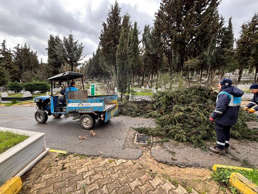 Ramazan ayında artan ziyaretçi yoğunluğu göz önünde bulundurularak yürütülen çalışmalarda, mezarlık alanlarında kurumuş, kırılma riski taşıyan ve düzensiz uzayarak tehlike oluşturabilecek dallar kontrollü şekilde budandı. Ekipler, hem ziyaretçilerin güvenliğini sağlamak hem de ağaçların sağlıklı gelişimini desteklemek amacıyla budama işlemlerini uzman personel eşliğinde ve iş güvenliği kuralları çerçevesinde gerçekleştiriyor.