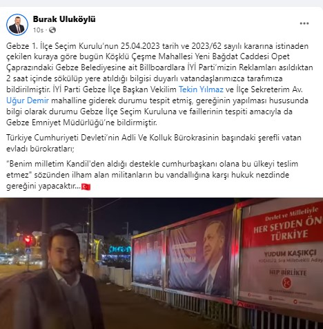 "Gebze 1. İlçe Seçim Kurulu’nun 25.04.2023 tarih ve 2023/62 sayılı kararına istinaden çekilen kuraya göre bugün Köşklü Çeşme Mahallesi Yeni Bağdat Caddesi Opet Çaprazındaki Gebze Belediyesine ait Billboardlara İYİ Parti’mizin Reklamları asıldıktan 2 saat içinde sökülüp yere atıldığı bilgisi duyarlı vatandaşlarımızca tarafımıza bildirilmiştir. İYİ Parti Gebze İlçe Başkan Vekilim Tekin Yılmaz ve İlçe Sekreterim Av. Uğur Demir mahalline giderek durumu tespit etmiş, gereğinin yapılması hususunda bilgi olarak durumu Gebze İlçe Seçim Kuruluna ve faillerinin tespiti amacıyla da Gebze Emniyet Müdürlüğü’ne bildirmiştir.