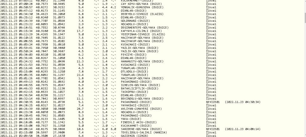 KANDİLLİ RASATHANESİNDE DÜZCE DEPREMİ VE ARTÇILARI TABLOSU: