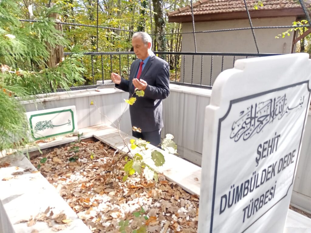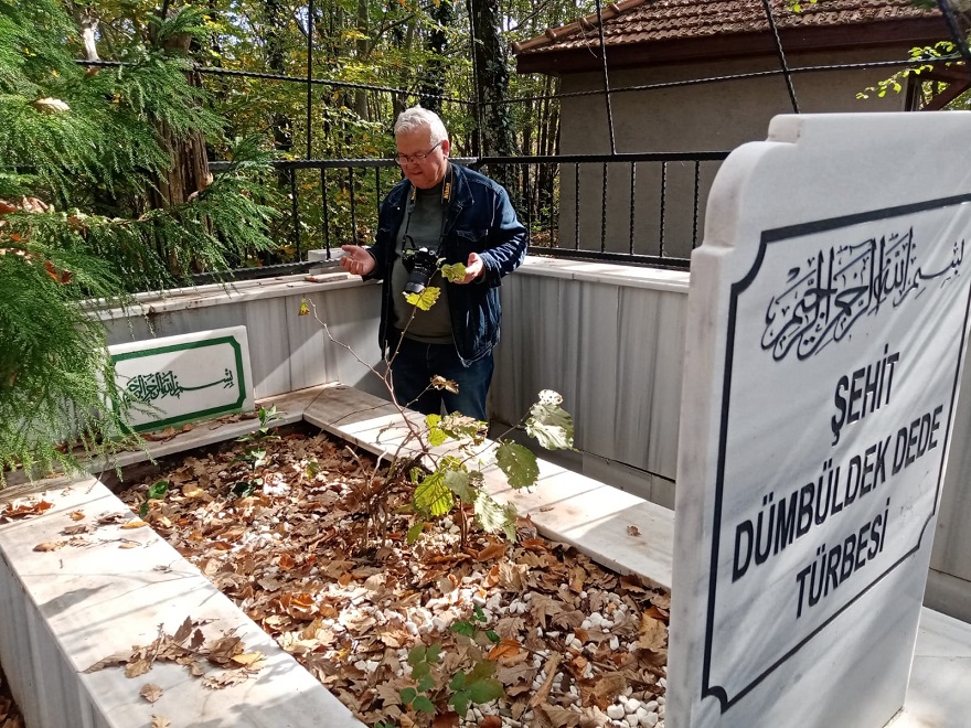 Türbe bizi derdin bir sessizlik ve ormanın döktüğü sararmış yaprak örtüsü ile karşılıyor. Derin ve manevi bir huzur hakim buraya...Burada hem dinlenip hem Şehit Dümbüldek Dede için dua ediyoruz Ali Osman Başkan ile birlikte...