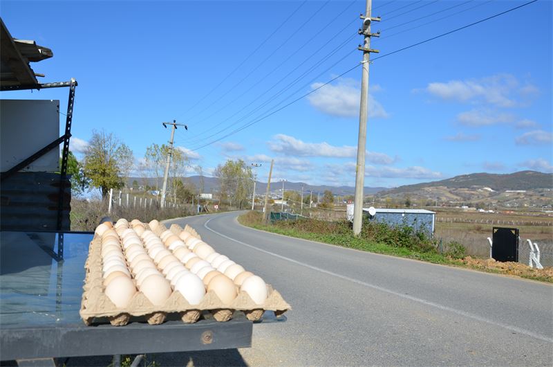 TAZE KÖY YUMURTALARI YOL KENARINDA SATIŞTA: Köylü kendi yetiştirdiği tavuklarından ele edilen yumurtaları satışa ve beğeniye yol kenarına çıkartarak sunmuş vaziyette...