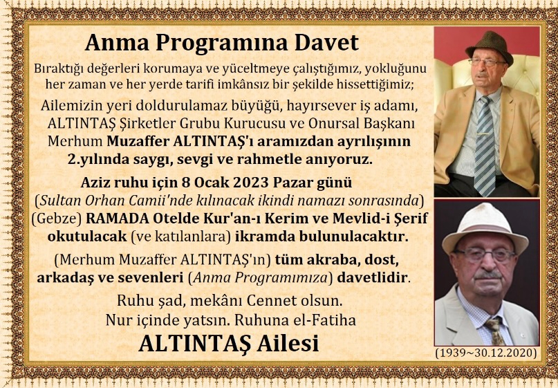 30 Aralık 2020 tarihinde Covit-19 sebebiyle 81 yaşında hayata gözlerini yuman Gebze'nin hayırsever iş insanı Muzaffer Altıntaş için vefatının 2. yılı devriyesinde Mevlid- i Şerif okutulacak.