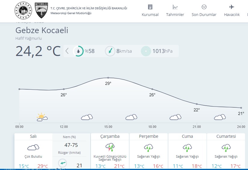 Meteoroloji'den yapılan son değerlendirmeye göre Marmara bölgesi geneli ve İç Ege'de sağanak ve gök gürültülü sağanak yağış bekleniyor. Bölge genelinde toz taşınımı ile birlikte yer yer çamur şeklinde yağış olması bekleniyor. Bugün Gebze Bölgesi'nde hava açık ve güneşli, en yüksek derece 29 (saat: 15:00 civarı) en düşük derece 14 olacak. Akşamın ilerleyen saatlerinde ise 22:00 civarında sağnak geçiş beklentisi de mevcut.