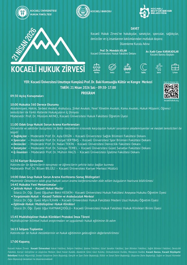 Kocaeli Üniversitesi Hukuk Fakültesi ev sahipliğinde, Kocaeli Barosu ve Kocaeli Büyükşehir Belediyesi iş birliğiyle düzenlenen “Kocaeli Hukuk Zirvesi”, 21 Nisan 2026 tarihinde Kocaeli Üniversitesi Umuttepe Kampüsü Prof. Dr. Baki Komsuoğlu Kültür ve Kongre Merkezi’nde gerçekleştirilecek.