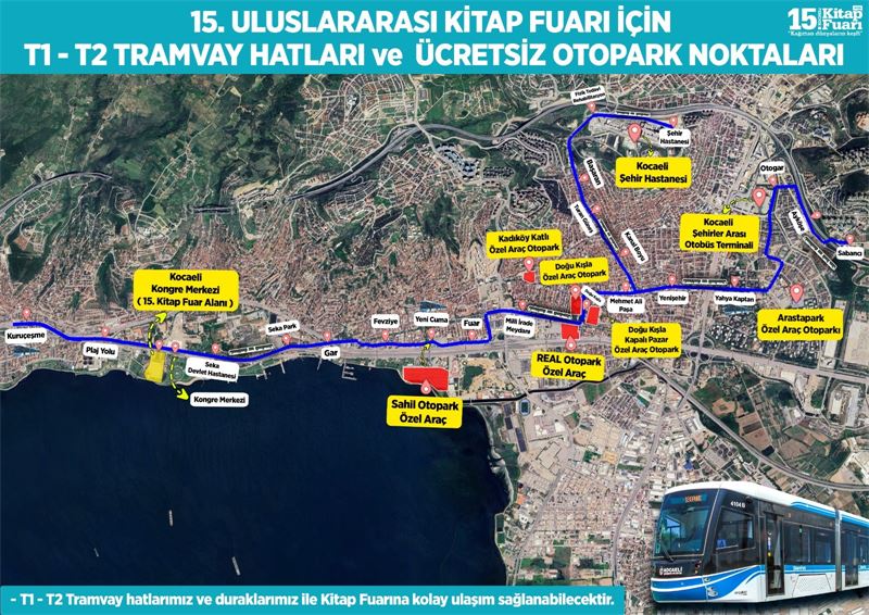 Kocaeli Büyükşehir Belediyesi, 04-12 Ekim tarihlerinde düzenlenecek 15. Kocaeli Kitap Fuarı’na ziyaretçilerin kolay ve konforlu ulaşımı için ücretsiz ring seferleri, tramvay hattı entegrasyonu ve ücretsiz otopark hizmeti sağlayacak.