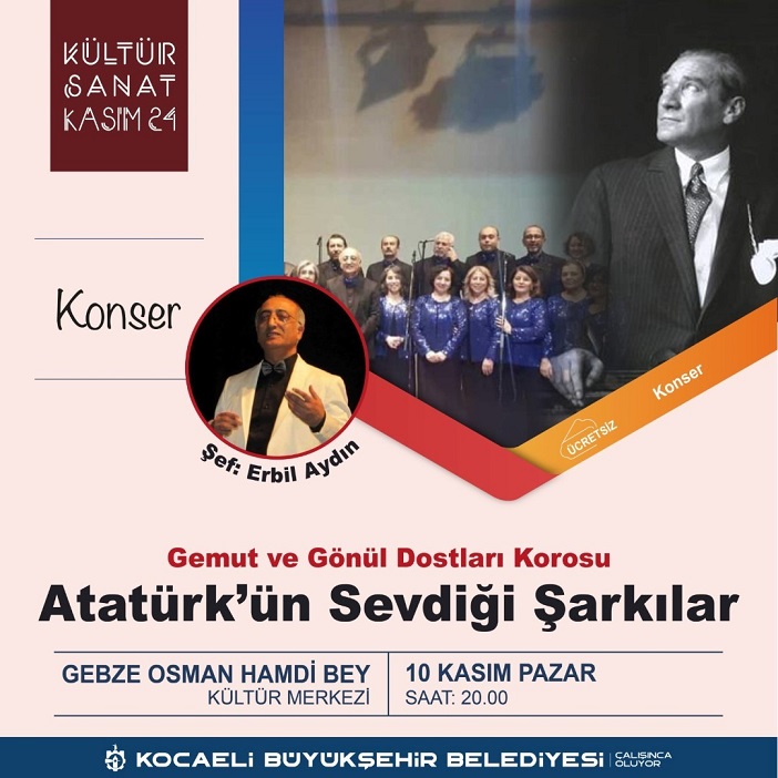 Gebze’de gerçekleşecek konsere ise Osman Hamdi Bey Kültür Merkezi ev sahipliği yapacak. Şef Erbil Aydın yönetimindeki konserde Gemut ve Gönül Dostları Korosu Atatürk’ün sevdiği şarkı ve türküleri seslendirecek.