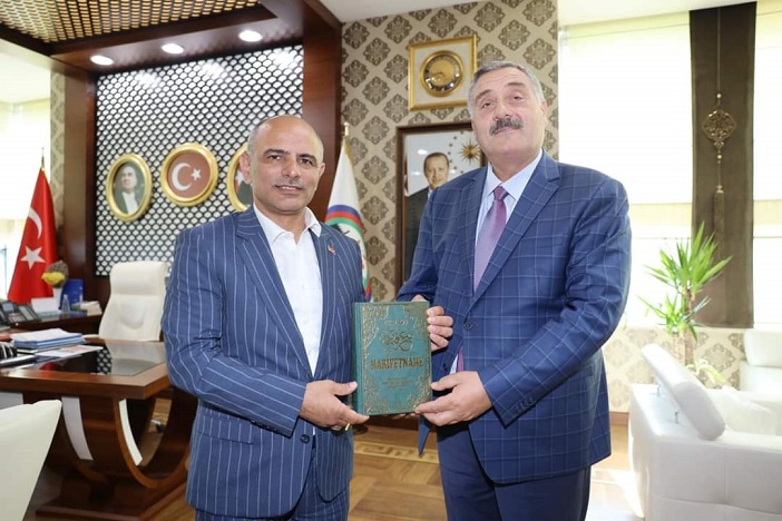 Ziyaret esnasında Vakıf Başkanı Ahmet ÖNAL Erzurum'lu İbrahim Hakkı Hazretlerinin " MARİFETNAME " isimli kitabı Başkan Söğüt'a takdim ederken,