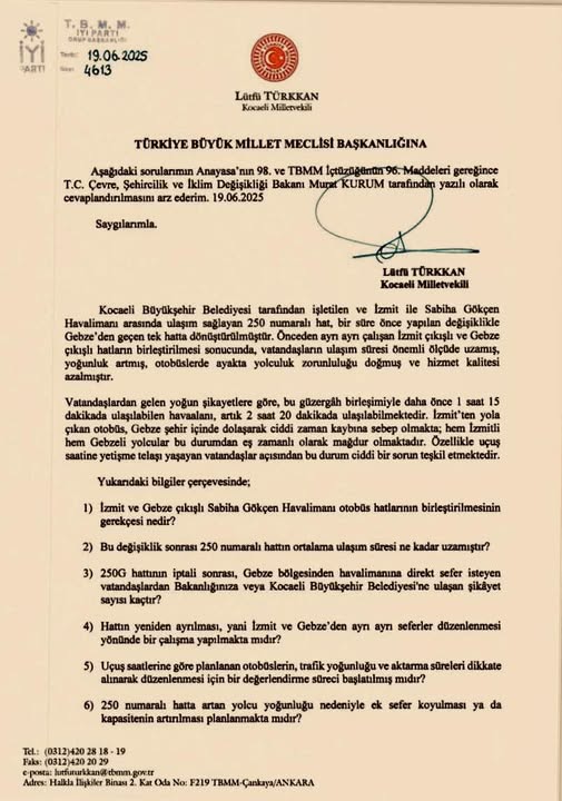 İYİ Parti Kocaeli Milletvekili Lütfü Türkkan, Sabiha Gökçen Havalimanı’na giden 250 G hattının kaldırılması hususunda bunun ulaşım adaletsizliği olduğuna işaret ederek konuyu, Çevre Şehircilik ve İklim Değişikliği Bakanı Murat Kurum'un yanıtlaması istemiyle TBMM’ye taşıdı.
