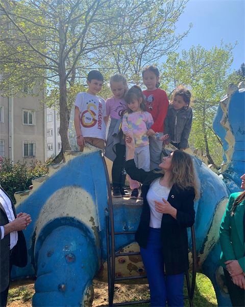 Serap Çakır, Şekerpınar bölgesinde parkta oynayan çocukları da ziyaret ederek onlarla bir süre sohbet etti.