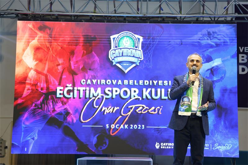 Çayırova Belediye Başkanı Bünyamin Çiftçi, onur gecesinde bir konuşma gerçekleştirdi. Çiftçi konuşmasında; “Aslında bu 3,5 yıllık bir hikâye. Olmazsa olmazımız, geleceğimiz, her şeyimiz, yavrularımız ve gençlerimizin en güzel şekilde yetişebilmeleri adına Cumhuriyetimizin Kurucusu büyük önder Atatürk’ün söylediği gibi sağlam kafa sağlam vücutta bulunur ilkesiyle yavrularımızın gençlerimizin spor alanında fiziksel gelişimlerini en güzel şekliyle tamamlamak ve sağlam bir kafayla hayata hazırlanmaları adına bizler 3, 5 sene önce spora yatırım yapma kararı aldık. Attığımız adım ve yaptığımız yatırımlarla Çayırovamızızı spor kenti yaptık. Rabbime hamd ediyorum, bu gece onur gecesi. Bu gece yavrularımızın ve siz değerli velilerimizin onur gecesi. Biz sizlerle onur ve gurur duyuyoruz. İyi ki varsınız’’ dedi.