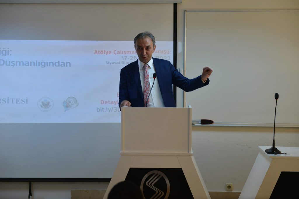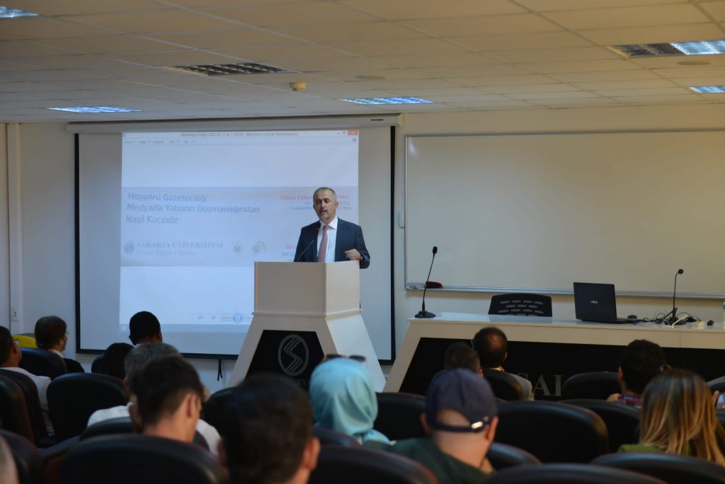Atölye Çalışması düzenleme üyesi Sakarya Uygulamalı Bilimler Üniversitesi Sakarya MYO Gazetecilik ve Habercilik Bölüm Başkanı Öğr. Gör. Zülfikar Özçelik de medyanın gücüne ve sorumluluğuna vurgu yaptığı konuşmasında, “Kamu görevini yerine getiren basın, yapısında barındırdığı gücünü sorumluluk bilinciyle ve kamu yararı gözeterek kullanmak mecburiyetindedir. Bu güç, iyi niyetli olmayan art niyetli kişilerin elinde tehlikeli olabilmektedir. Gazetecilik faaliyetlerinin mesleğin ilkelerinden uzaklaşması, toplumda nefreti yayan, din, dil, ırk ve cinsiyet ayrımcılığını körükleyen bir hal alması, çıkar sağlanılan çevrelerin propanganda aracına dönüşüyor olması meslek ve toplum adına ciddi bir sorundur. Bunun bazı örneklerini Batıda İslamafobiyi körükleyen yayınlarda görmüştük. Irak ve Suriye yangınından kaçan mültecilerle nefret söyleminin kültürel ve ırkçı bir yaklaşımı da kapsadığını gözlemliyoruz. Kendi kendilerine yazıp çizdikleri İnsan Hakları Evrensel Bildirgesi’ni unutan Batılı ülkelerin kendilerinden görmedikleri inanç ve ırklara karşı takındıkları tavır insanlık için utanç vericidir. Batı ülkeleri ve medyası Ukrayna’daki vahşete kızdığı ve üzüldüğü kadar sahile vuran binlerce Aylan bebeğe üzülemedi. Türkiye Cumhuriyeti Devleti ve halkı binlerce yıllık birikimiyle tarafı olmadığı, kaynağı olmadığı bu Ortadoğu ateşini söndürmek için büyük fedakarlık ve gayret gösterdi. Elbette göç edenler ve göç olunan yerler açısından sorunlar var. Ancak bu sorunları medya aracılığıyla yabancı düşmanlığına dönüştürmek asıl sorundan daha büyük sorunlara yol açabilir. İnternetin ve özellikle de sosyal medyanın etkisiyle medya haberlerinin değişimi, geleneksel gazetecilik duyarlılıklarının azalmasına da neden oldu. Bilginin doğruluğunun sağlanması beklenilmeden sansasyonel başlık ve görüntülerle daha fazla tıklanma derdiyle bir an önce yayına verilen haberler telafisi zor birçok sorunu doğurabilir.” ifadelerini kullandı.