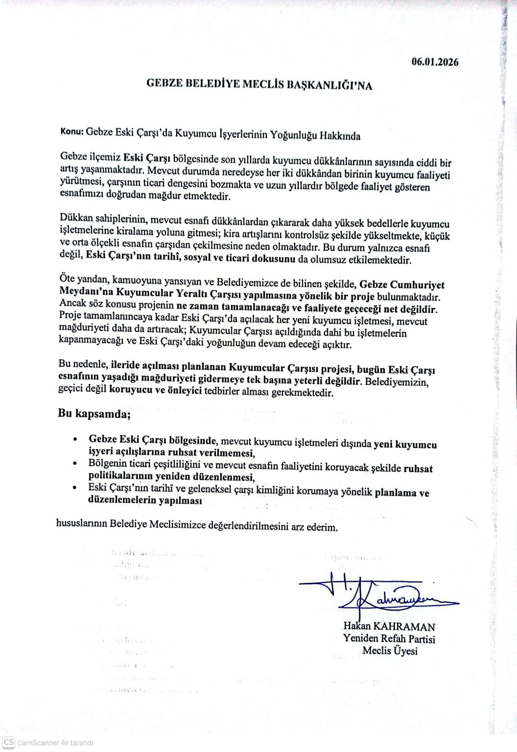 Gebze Belediyesi'nin Yeniden Refah Partili Meclis Üyesi Hakan Kahraman, 6 Ocak (dün) tarihinde gerçekleşen Belediye Meclis toplantısında Meclis Başkanlığı'na ilginç bir önerge verdi. Kahraman verdiği önergesinde Eski Çarşı bölgesinde son yıllarda kuyumcu dükkânlarının sayısında ciddi bir artış yaşandığını, neredeyse her iki dükkândan birinin kuyumcu faaliyeti yürüttüğünü bu durumun da uzun yıllardır bölgede faaliyet gösteren esnafımızı doğrudan mağdur ettiğini, bu hususta artık buraya yeni ruhsat verilmemesini önerdi. Kahraman'ın önergesi şöyle: