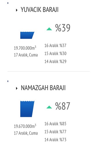 Bölgemizin en önemli su kaynağı olan Yuvacık Barajı’ndaki su seviyesi 14 Aralık 2021 tarihinde Yüzde 29 olarak ölçülmüş, diğer su kaynağımız olan Namazgah Barajındaki su seviyesi de yüzde 73 olarak saptanmıştı. İSU Genel Müdürlüğü’nün son ölçüm ve verilerine göre, son yağışlarla birlikte Yuvacık barajında sadece 3 gün içinde su seviyesi yüzde 29’dan yüzde 39’a yükseldi. Namazgah Barajındaki su seviyesi de son yağışlarla birlikte yüzde 73’ten yüzde 87’ye yükseldi. İşte her iki barajımızdaki su seviyeleri şöyle: